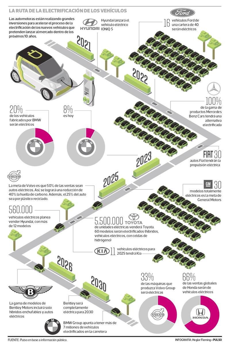 Además de la conocida Tesla, General Motors, Ford Motor Company, Volvo, Fiat y Volkswagen, son solo algunas de las grandes automotoras que han anunciado ambiciosos presupuestos, planes de acción y objetivos para la próxima década, todo con el objetivo de modernizar su oferta, aumentando la cantidad de vehículos híbridos y eléctricos, lo que ayudaría con el objetivo global de bajar las emisiones de CO2.