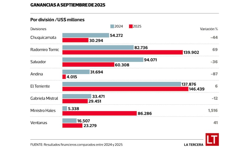 Al ser comparadas las ganancias consolidadas de las divisiones a septiembre de 2025, destaca favorablemente la división Ministro Hales, cuyo aumento fue de 1.516%, pasando de utilidades por US$5 millones a US$86 millones. Además, la división Radomiro Tomic presentó un alza de 69% en sus ganancias, aumentando de US$82 millones en los nueve meses de 2024 a US$139 millones en el mismo periodo de este año.