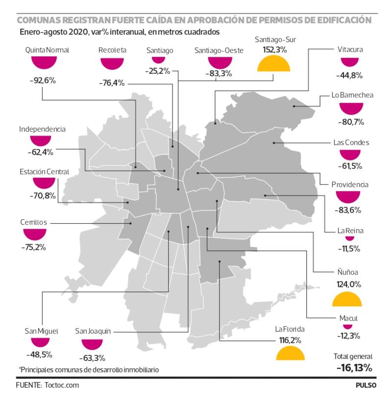 De acuerdo con el análisis de Toctoc.com, las comunas donde aumentan los permisos de edificación son Ñuñoa y La Florida, con alzas de 124% y 116%, respectivamente. El aumento en estas comunas se debe en gran medida a los procesos de cambios de Plan Regulador Comunal (PRC).