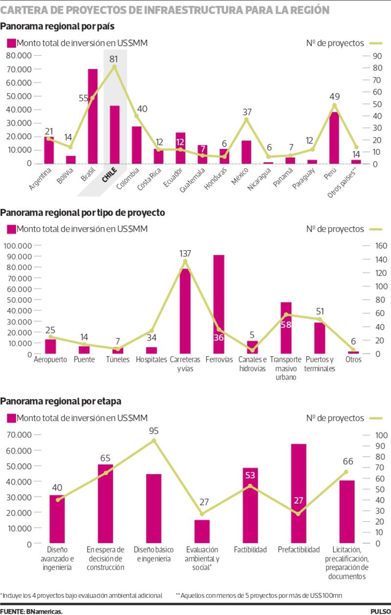 De acuerdo con un informe de BNamericas, en Latinoamérica hay 376 proyectos por US$300.000 millones. De ese total, Chile tiene 81 iniciativas por un monto de US$40.000 millones. Asimismo, más del 40% de los proyectos superiores a US$100 millones que figuran en su base corresponde carteras viales, incluidos túneles y puentes.