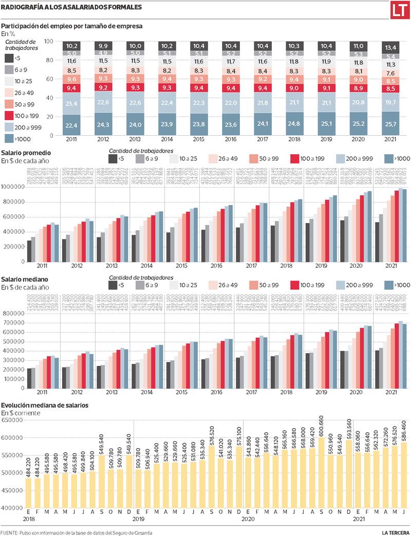 De acuerdo con datos del Seguro de Cesantía, las firmas con más de 200 trabajadores suman el 45,4% del empleo total asalariado del país. Asimismo, las empresas de más de 1.000 empleados tienen un cuarto del total de ese tipo de puestos de trabajo (25,7%). Mientras, las que tienen 5 trabajadores o menos subieron de 10,4% antes de la pandemia, a 13,4%. Además, la mediana de salarios va aumentando según el tamaño de las empresas.