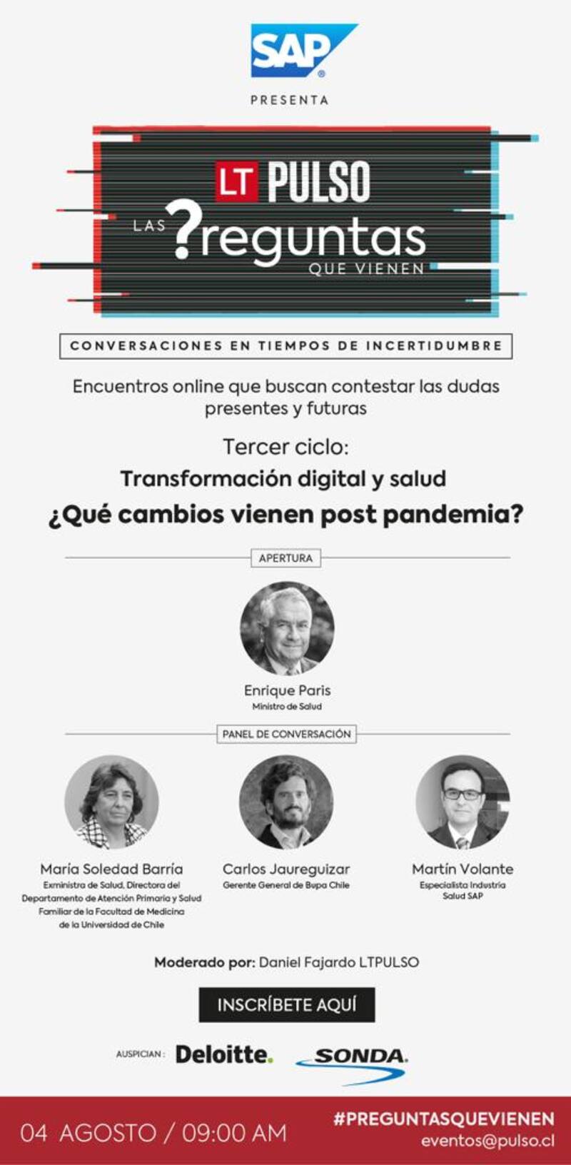 ¿Cómo será la transformación digital en la salud pos pandemia? Estas son las interrogantes de la próxima edición de “Las preguntas que vienen” de PULSO, a realizarse el próximo martes 9 de agosto a las 9:00 AM y que tendrá como invitado estelar al ministro de Salud, Enrique Paris.