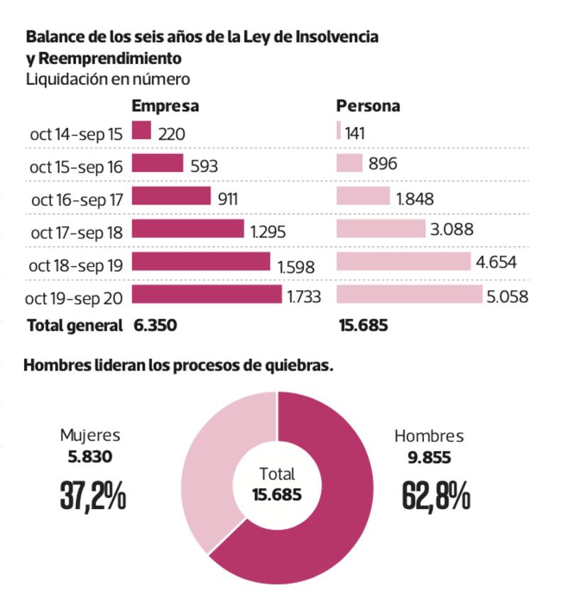 Seis años cumplió el viernes recién pasado la Ley de Insolvencia y Reemprendimiento. Y de acuerdo con el superintendente, se ha cumplido con la meta de agilizar los procedimientos. Según describe, con la antigua Ley de Quiebras, se registraron 5.300 procedimientos en 34 años, y mayoritariamente empresas, porque las personas tenían escasa posibilidad de acogerse a la normativa. En cambio, ahora, menciona que “ya tenemos más de 28 mil procedimientos, ( entre liquidaciones y reorganizaciones) a través de las cuales las empresas, y también las personas naturales, han podido hacer frente a la situación de insolvencia, reestructurar sus pasivos y sus deudas de manera mucho más efectiva, así como también acceder a una liquidación de menor duración, en aquellos casos donde no hay viabilidad”.