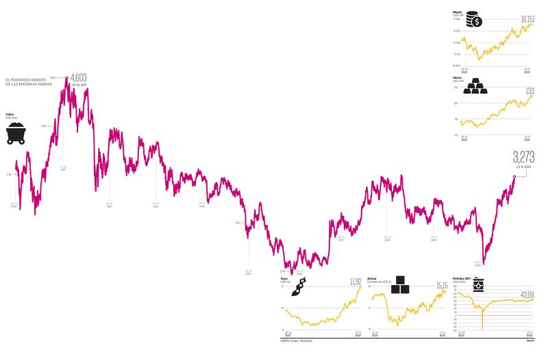 Desde los mínimos que se tocaron en medio de los estrictos confinamientos que marcaron el primer y segundo trimestre del año, los rebotes son superiores al 40% del azúcar, soya y niquel, de más de 56,6% en el caso del cobre, de 78,8% en el caso del hierro y un incalculable salto de los -US$37,68 que costó el barril de petróleo WTI el 20 de marzo a los US$43,04 con el que cerró la sesión de ayer (revisar infografía).