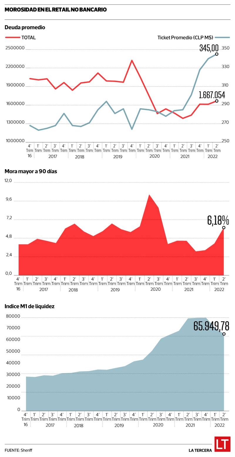 Informe de Sheriff reveló que la deuda promedio de los clientes de Hites, La Polar, ABCDin y Tricot al cierre del segundo trimestre de 2022 alcanzó $345 mil. Se trata del monto más alto desde diciembre de 2016 y hace un año que el indicador sólo conoce de alzas. Por otro lado, el nivel de provisiones que realiza el retail no bancario es casi 20 veces mayor al de la banca.