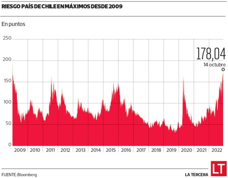 Si bien luego del triunfo del Rechazo en el plebiscito del 4 de septiembre por una nueva Constitución, el riesgo país tuvo un descenso desde los 145 a un mínimo de 116 puntos el 12 de septiembre, de allí en más comenzó una rápida escalada hasta cerrar en la jornada del viernes pasado en los 178 puntos, lo que se traduce en un alza de casi 53,1%.
