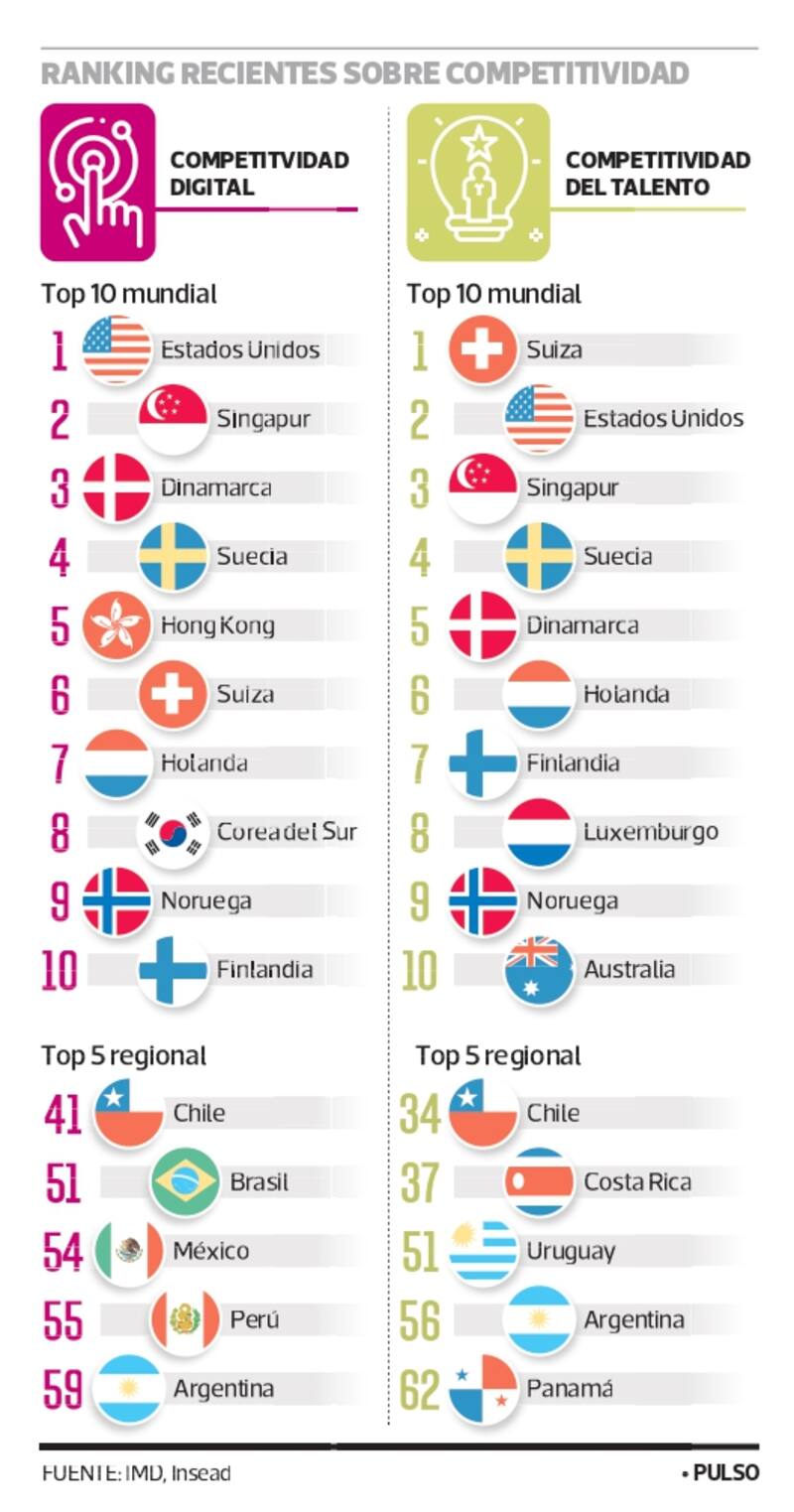 De esta manera, aunque nuestro país es el primero a nivel regional tanto del “Índice de Competitividad Digital IMD”, del que ha participado Olavarrieta, y del “Índice de Talento competitivo Global”, de Insead, ya no destaca como lo hizo en el pasado en la escena mundial.