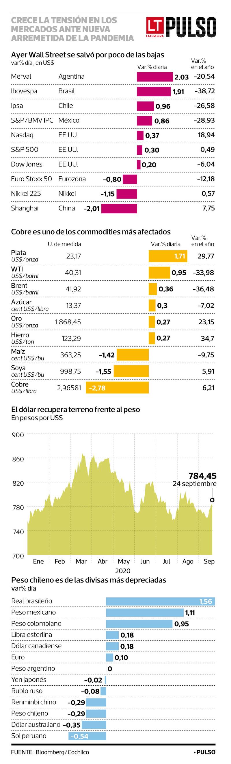 “Esto es una consecuencia de mayores temores respecto al futuro de la economía mundial durante el resto del año, producto de agresivos rebrotes de la pandemia, principalmente en Europa”, explica Juan Carlos Guajardo, director ejecutivo de Plusmining, agregando que en ese contexto “los inversionistas a nivel mundial han buscado refugio en el dólar, dejando atrás activos riesgosos, como commodities metálicos y renta variable, impulsando al alza la divisa norteamericana y presionando a las bolsas internacionales”.