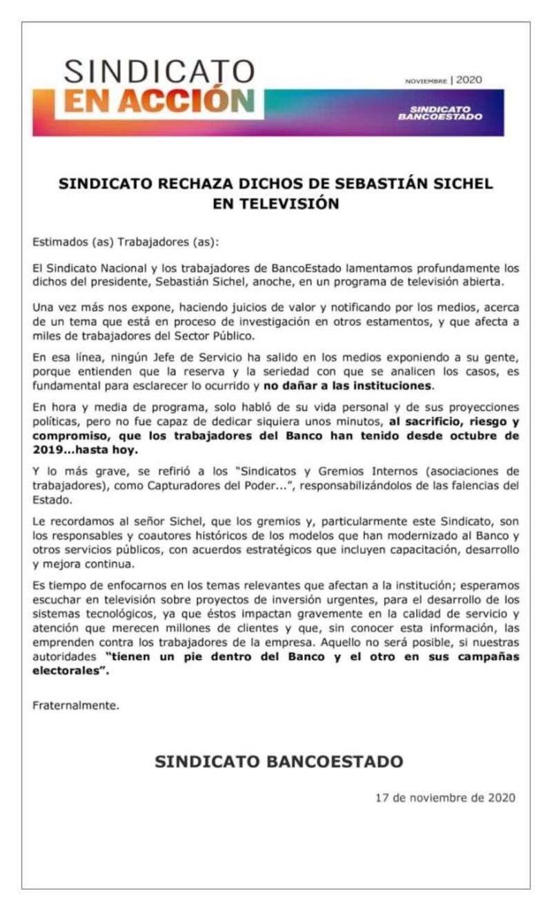 En el documento, se quejaron además que en el programa Sichel sólo habló de su vida personal y proyecciones políticas, y que no destacó el esfuerzo de los trabajadores de la institución desde el estallido social hasta la fecha.