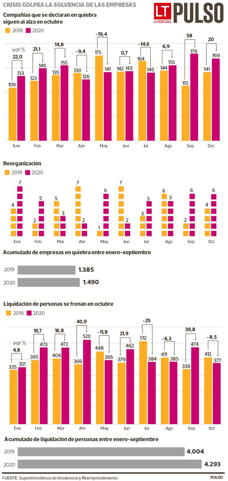 En el detalle, la Superintendencia de Insolvencia y Reemprendimiento informó que en octubre 169 firmas tuvieron que iniciar un proceso de liquidación. Esto es 20% mayor a lo registrado en octubre de 2019, aunque la cifra es levemente menor a los 179 procesos que se iniciaron en septiembre.