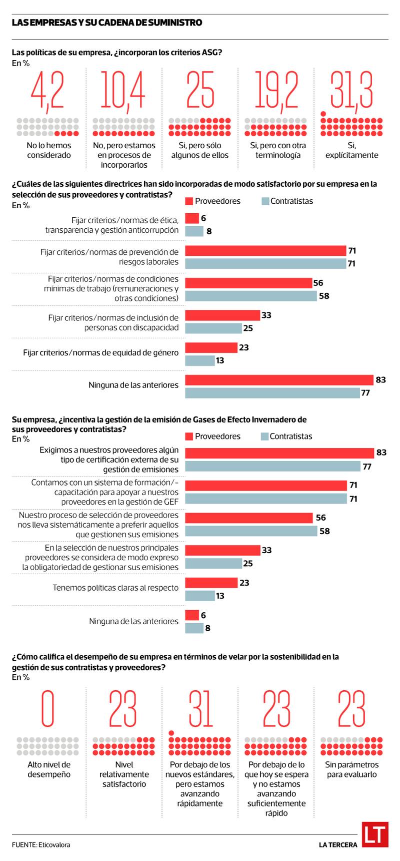Pero una cosa es la compañía por dentro y otra, lo que corresponde a su grado de influencia externa. O sea, a los proveedores y contratistas que componen su cadena de suministro. Ese fue justamente el tema que abordó una encuesta de la consultora en sostenibilidad Eticolabora, la que concluye que mientras las grandes empresas son parte del segmento “de avanzada” con respecto a prácticas de sostenibilidad, en lo que se refiere a velar por ese aspecto en la gestión de sus contratistas y proveedores, el 23% se autocalifica “en un nivel relativamente satisfactorio”, mientras que cerca de un tercio dice estar en un nivel “por debajo de los nuevos estándares, pero avanzando rápidamente”. La consulta se realizó a una base de 200 ejecutivos de alta dirección de grandes firmas que operan en Chile y fue aplicada entre el 31 de agosto y 9 de septiembre de este año. Y aunque la mayoría de los participantes declaran que sus empresas conocen los temas de ASG, poco menos de un tercio ha incorporado estos criterios de manera explícita.