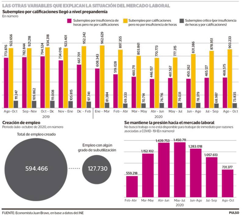 Según Bravo, el subempleo por calificación es el que más ha aumentado durante los últimos tres meses. “Si comparamos respecto de mayo-julio 2020, que fue el punto más bajo en materia laboral durante la crisis, vemos que el subempleo por calificaciones ha aumentado considerablemente, y que ya está cerca de alcanzar los niveles observados el año anterior. Esto revela otra arista que da cuenta de la debilidad de la situación económica y su impacto en el mercado laboral”, menciona. Según las cifras, este subió en 16,2%, lo que se traduce en que 125.918 personas más trabajan en empleos menos calificados para su nivel de preparación entre mayo y octubre.