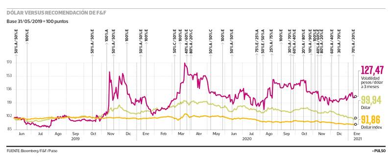 El efecto de las recomendaciones de cambios de fondos es algo que desde hace un tiempo todas las corredoras y las mesas de dinero siguen. Y es que, por ejemplo, el Fondo A está en un 85% invertido en el extranjero, por lo que una recomendación por exponerse aún más a este vehículo implica que las administradora de fondos de pensiones debe comprar dólares para invertir fuera del país, en tanto una apuesta por el fondo E, significa venta de dólares, pues en un 87,1% está en activos chilenos,