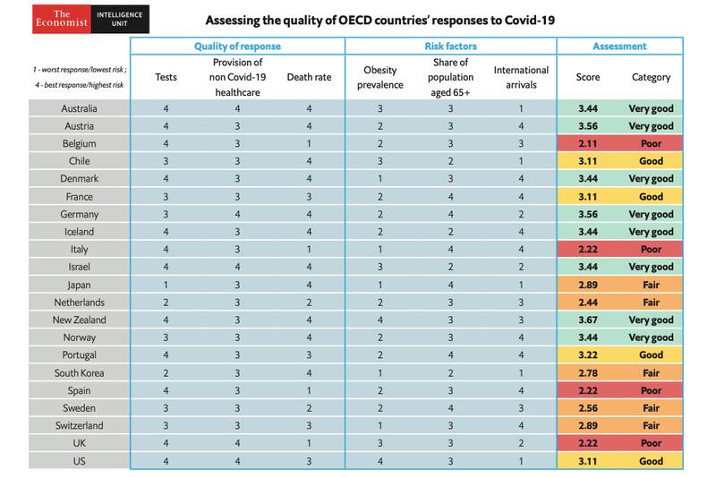 Economist Intelligence Unit (EIU), la unidad de análisis de la prestigiosa publicación The Economist, comparó el desempeño de Chile en relación a la pandemia de coronavirus, con países como EE.UU. y Francia, superando además al Reino Unido, Italia, España y Bélgica, entre 21 países OCDE.