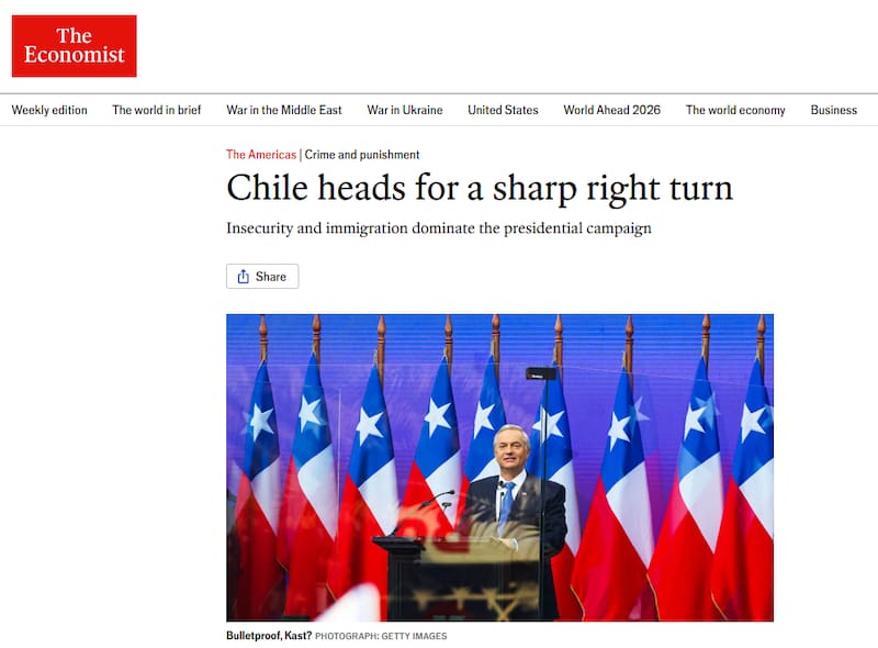 “Por primera vez desde el retorno de Chile a la democracia en 1990, los partidos de derecha podrían tener una mayoría, aunque fragmentada, en ambas cámaras. Si Kast, o cualquier otro candidato de derecha, triunfa en diciembre, podrían tener la oportunidad de llevar a Chile por un nuevo camino”, sentenció una nota de The Economist, un medio autocalificado como de “centro radical”, por su posición a favor de la desregulación y privatización y tener una postura progresista en temas valóricos, según explicó en su momento.