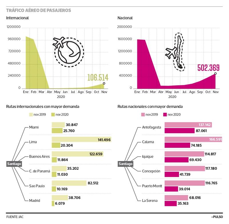 De acuerdo con los datos de la Junta de Aeronáutica Civil (JAC) -organismo dependiente del Ministerio de Transportes y Telecomunicaciones- 502.369 corresponden a pasajeros nacionales, que se traducen en una reducción de 58,7% respecto al mismo mes del año pasado, y 106.514 internacionales, que representa una caída de 86,7% anual. Ambas caídas son inferiores a la que se observaron en octubre, de 67,9% y 91,9%, respectivamente.