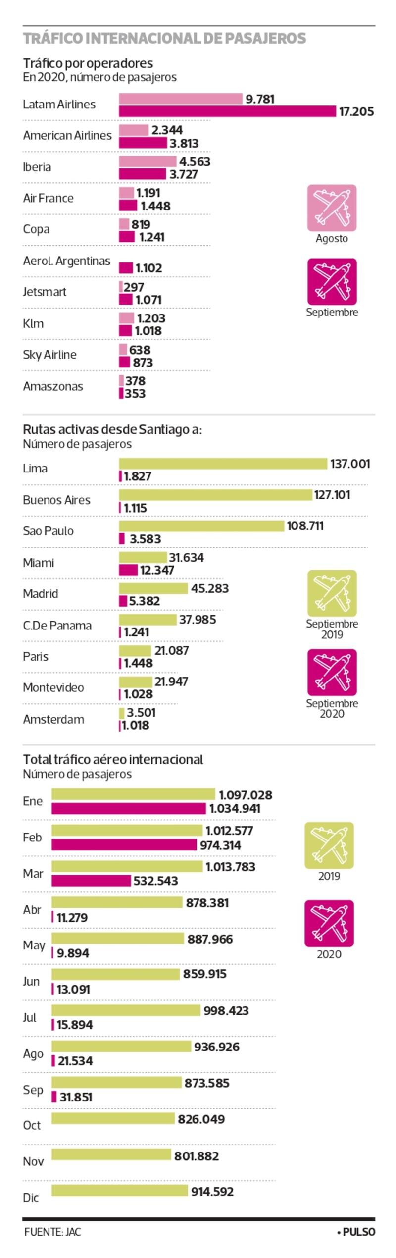 Al cierre del año pasado, 23 aerolíneas operaban en Chile. Hoy, esa cifra llega a diez y hay 14 rutas operativas, aunque todas con muy pocas frecuencias. La ruta Santiago-Miami fue la que concentró la mayor cantidad de pasajeros el mes pasado, con un total de 12.347 viajeros. Le sigue, muy de lejos, la ruta Santiago-Madrid, con 5.382 personas, y Santiago-Sao Paulo, con 3.583 pasajeros. Otras rutas que también están operativas, y que mueven en torno a mil pasajeros al mes, son Lima, Buenos Aires, París, Amsterdam y Ciudad de Panamá. American Airlines, por ejemplo, en agosto reinició sus operaciones con cuatro vuelos semanales entre Santiago y Miami, desde la próxima semana la operación será diaria.