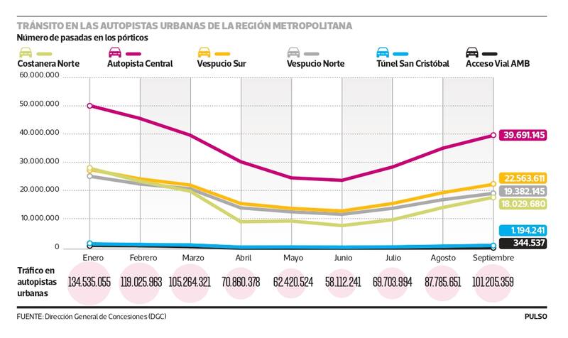 Según cifras de la Dirección General de Concesiones (DGC), en septiembre el flujo vehicular en las vías que atraviesan la capital -Costanera Norte, Autopista Central, Vespucio Sur, Vespucio Norte, Túnel San Cristóbal y Acceso Vial AMB- aumentó 15,3% respecto a agosto. Si se compara con junio, mes en que se produjo la menor circulación de autos por estas rutas producto de las cuarentenas, el alza llega a 74,2%.