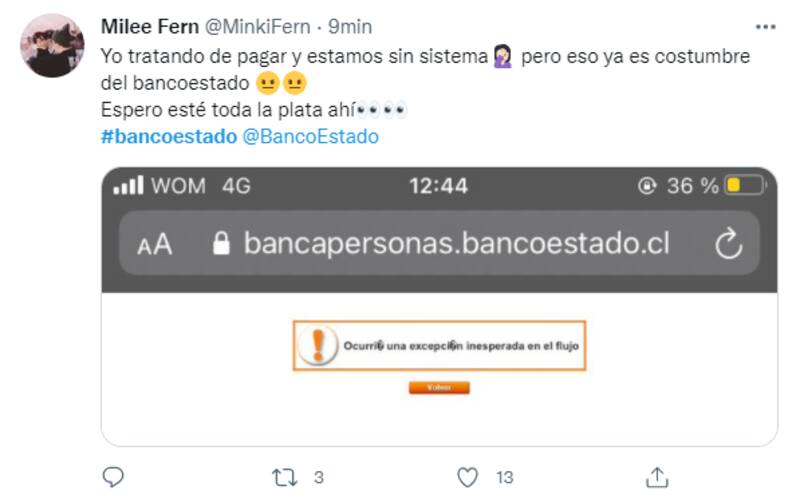 Frente a los reclamos por parte de los usuarios, desde la cuenta oficial de BancoEstado en Twitter, sugirieron realizar movimientos de dinero “más tarde”. Y dijeron que “el banco está trabajando para la pronta solución, lamentamos la incomodidad que pudiera causar”.