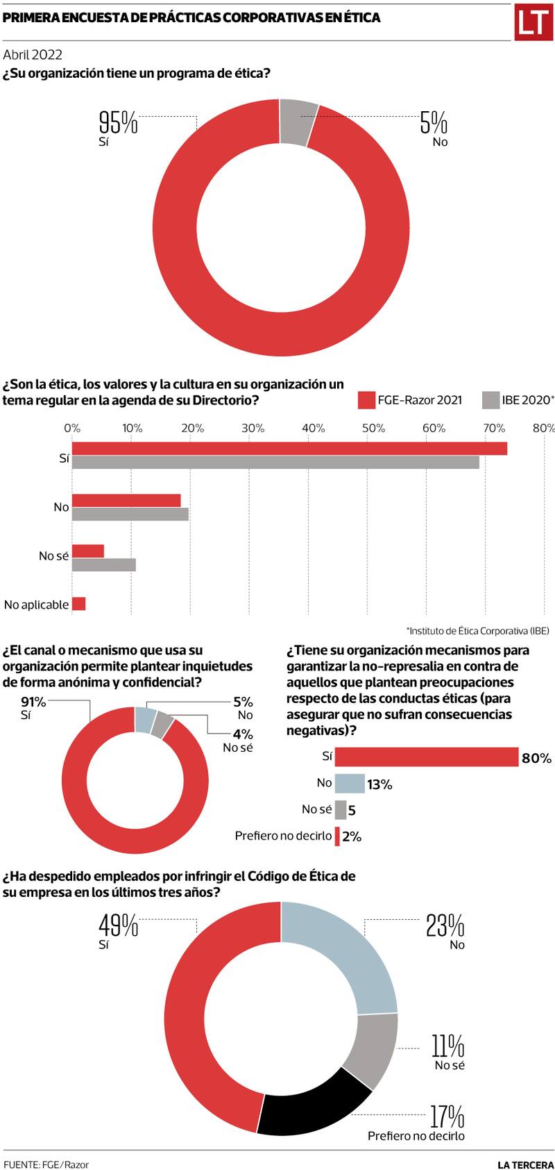 Menos de la mitad (45%) de las empresas en Chile cuenta con al menos un empleado enfocado de manera parcial o exclusiva a las temáticas de ética dentro de la organización. Sin embargo, un 95% de ellas ya tiene implementado un programa de ética. Estos son algunos de los resultados de la “Primera encuesta de prácticas corporativas en ética”, desarrollada por la Fundación Generación Empresarial (FGE) y Razor Consulting.