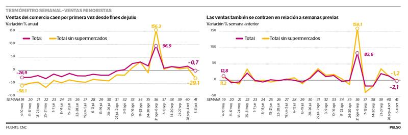 De acuerdo con el último reporte, correspondiente a la semana del 5 al 11 de octubre, las ventas cayeron 0,7% en relación al mismo período del año pasado. Al excluir supermercados se evidencia una contracción aún mayor, de 29,1% respecto a igual semana de 2019. Ahora, si se compara con la semana inmediatamente anterior, la baja total fue de 2,1%. Si se excluye supermercados, el retroceso es de 1,2%.