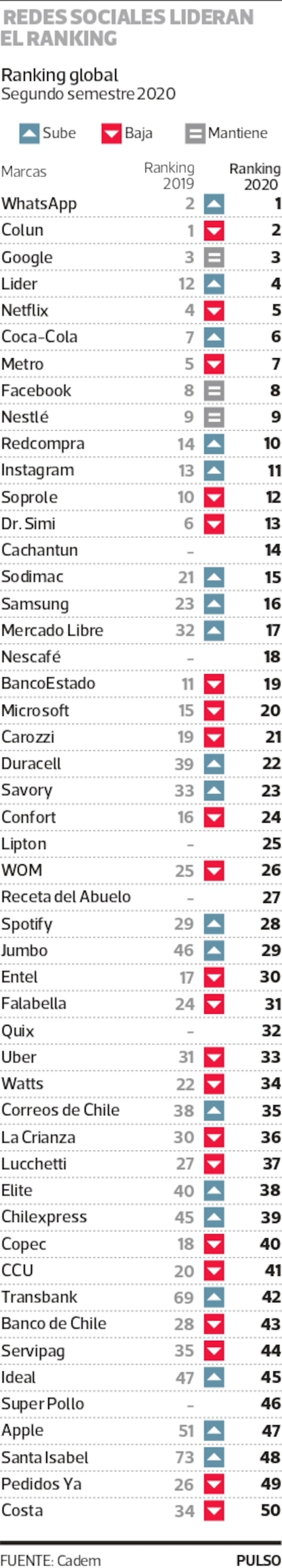 Netflix bajó al quinto lugar desde el puesto 4. Coca-Cola subió desde el puesto 7 al 6, y el Metro de Santiago descendió dos puestos al ubicarse en séptimo lugar. Facebook y Nestlé se mantuvieron en el octavo y noveno lugar, respectivamente. Para cerrar el top ten, RedCompra avanzó a la décima casilla, luego de estar en la decimocuarta en 2019.