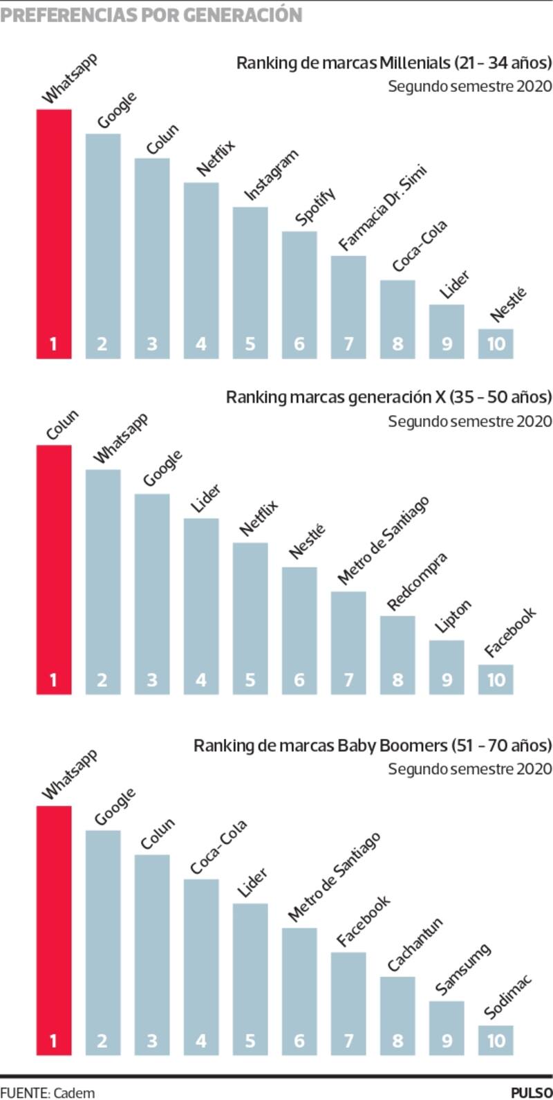 Así, Whatsapp se impuso como la líder de las marcas más valoradas, tras saltar desde el segundo al primer lugar. Colun, que antes estaba primero, se posicionó como el número 2. Google se mantuvo en el tercer lugar, seguido de Lider que pasó al cuarto lugar, luego de pegar un salto desde la casilla número 12.