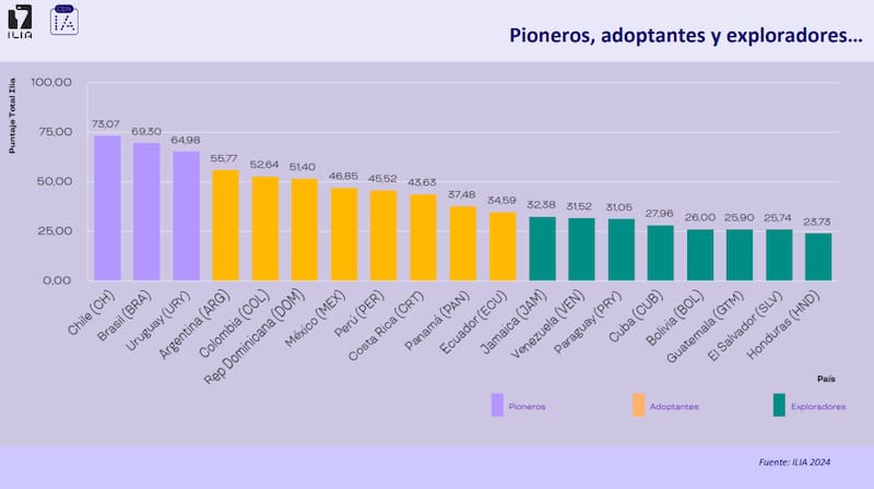 En esta ocasión se evaluó la situación de 19 países de la región, 7 más que la versión anterior, donde se midió el nivel de preparación de cada uno de ellos en relación con la inteligencia artificial (IA). Del puntaje máximo de ILIA, Chile obtuvo el primer lugar del ranking con 73,07 puntos, seguido de Brasil (69,30) y Uruguay (64,98).