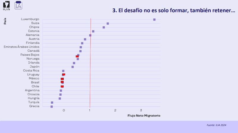 Durán también señaló que, si bien ha aumentado el desarrollo de talento humano especializado en IA en América Latina y el Caribe, aún estamos muy por debajo de las cifras del hemisferio norte. De igual forma, se observa una fuga de talento que no es retenido en la región, a excepción de Costa Rica y Uruguay, que han logrado atraer más talento del que han perdido. “Los tres países más destacados en Talento Humano son Chile (74,3), Uruguay (62,11) y Costa Rica (46,99)”, sostuvo.