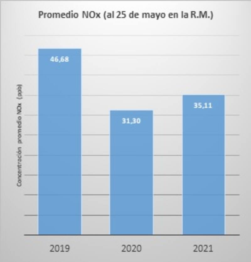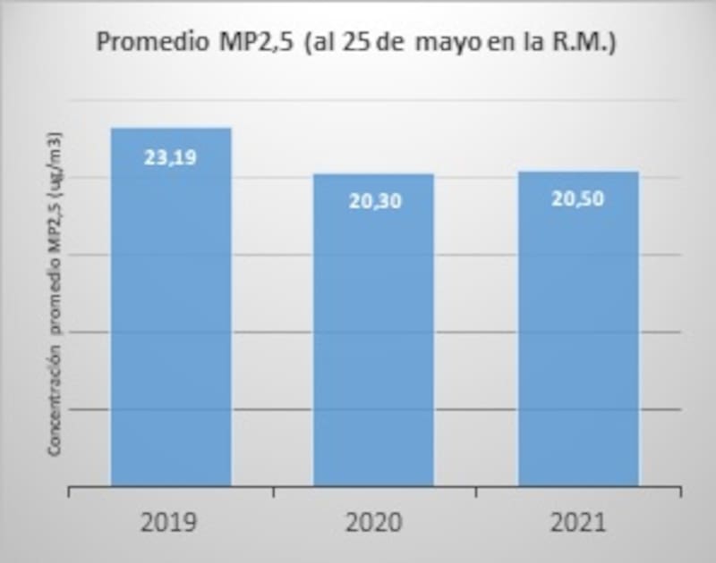Marcelo Fernández, jefe de la División de Calidad del Aire del Ministerio del Medio Ambiente, señala que al comparar los niveles promedio de MP2,5 en lo que va corrido del año (hasta el 25 de mayo), “no se observan diferencias entre 2021 y 2020, respecto de 2019. Ambos años aún muestran una baja del 12%”.