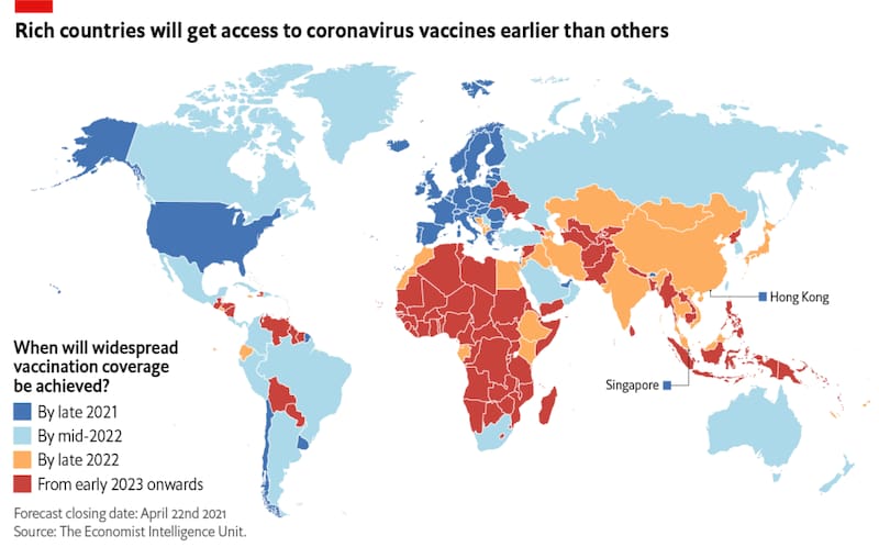 Las brechas en la vacunación existentes en el mundo podrían definir cuándo la pandemia podría terminar. Según una estimación de The Intelligence Unit de The Economist, casi la totalidad de América logrará vacunar entre el 60 al 70% de su población a mediados del 2022. Sin embargo, más de 85 países en vías de desarrollo no alcanzarán una inmunización generalizada antes de 2023 (incluso más tarde).