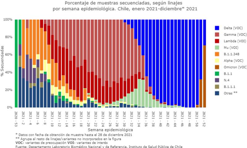 En la 51 (20 a 26 de diciembre), ya se observa la aparición de la variante Ómicron “con un aumento explosivo de 3,9% a 41,4% de las muestras ambulatorias estudiadas en tan solo una semana”, detalla el informe de la UC. Todas las cepas con esta variante corresponden a la Región Metropolitana. La variante Delta corresponde al 58,6% de las muestras estudiadas. Para la última semana del año (27 diciembre al 2 de enero), el informe resalta que la variante Ómicron progresa rápidamente correspondiendo al 73,2% de las variantes en circulación y el resto corresponde a variante Delta.