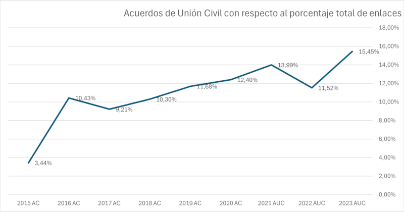 El porcentaje aumentó al 13,99% en 2021 y cayó al 11,52% en 2022 por la alza de matrimonios post pandemia. Sin embargo, el porcentaje de Acuerdos de Unión Civil se recuperó hasta el 15,45% en 2023, marcando la mayor presencia hasta ahora.