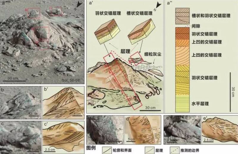 “Cuando miramos las imágenes de la cámara a bordo del rover, descubrimos que las estructuras de lecho de las rocas expuestas son significativamente diferentes de las rocas volcánicas comunes en la superficie de Marte, así como las estructuras de lecho formadas por arenas eólicas”, dijo Xiao, citado por la agencia espacial Xinhua.