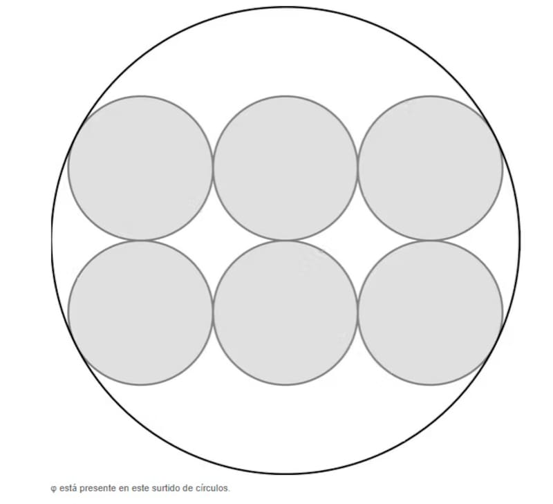 De manera similar, considere seis círculos del mismo tamaño, dispuestos en dos filas de tres y ubicados dentro de un círculo grande (como se muestra en la imagen). El radio del círculo grande es φ veces mayor que el diámetro de los círculos pequeños.