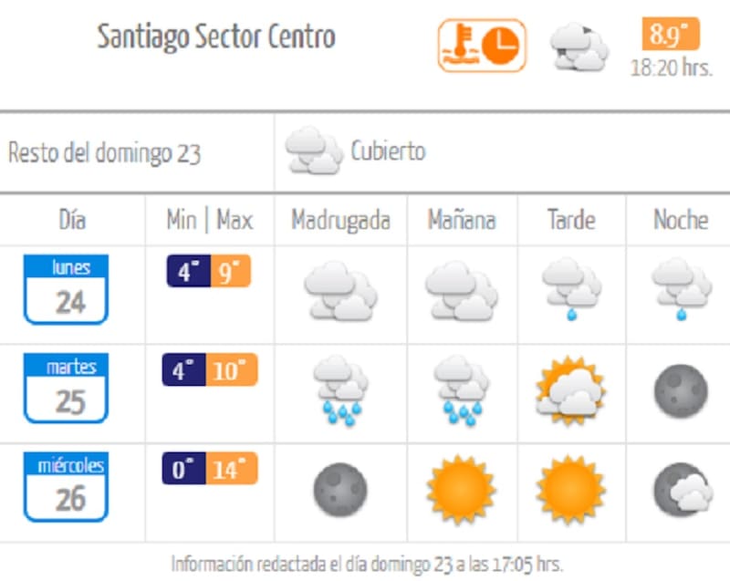 Entre Santiago y Rancagua, se esperan temperaturas que bordearán los 0 grados. Para el miércoles, según la DMC, la capital podría amanecer con 0°C, temperaturas mínimas que podrían subir conforme se avanza hacia el fin de semana, cuando las mínimas podrían situarse en torno a los 5°C.