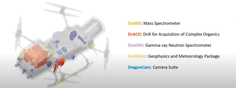 2.DraGNS (Dragonfly Gamma-Ray and Neutron Spectrometer): consiste en un generador de neutrones pulsados de deuterio-tritio, además de un conjunto de espectrómetros de rayos gamma y otro de neutrones para identificar la composición de la superficie bajo del módulo de aterrizaje.