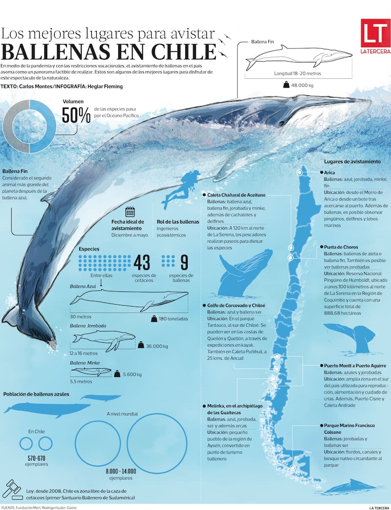 Pero es solo una de las varias especies de ballenas que se pueden ver en el país. Se estima que más del 50% de las especies de ballenas que existen en el planeta pasan por el Océano Pacífico, entre ellas la ballena azul, la jorobada, la fin y la pequeña minke, entre otras (ver infografía).