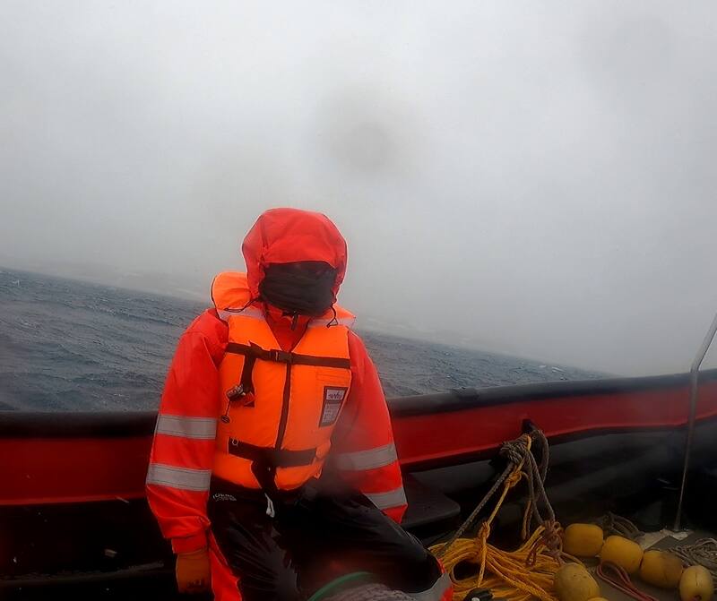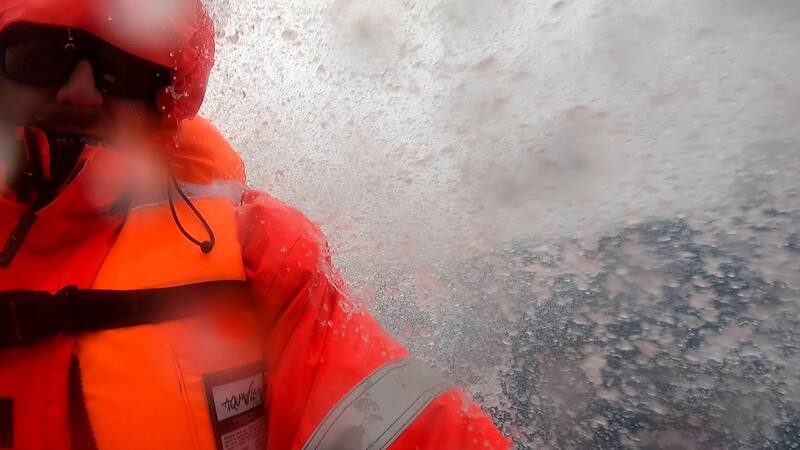 Entre la nevada y el agua que saltaba durante la navegación llegamos al primer punto de muestreo empapados, pero eso es irrelevante.