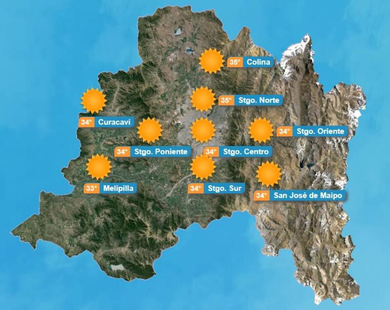 Y esta calurosa jornada alcanzó este martes su peak de temperatura. Según datos de la Dirección Meteorológica de Chile (DMC), en algunas zonas de Santiago, como Colina y Santiago Norte, el termómetro superó los 35°C (ver gráfica a continuación).