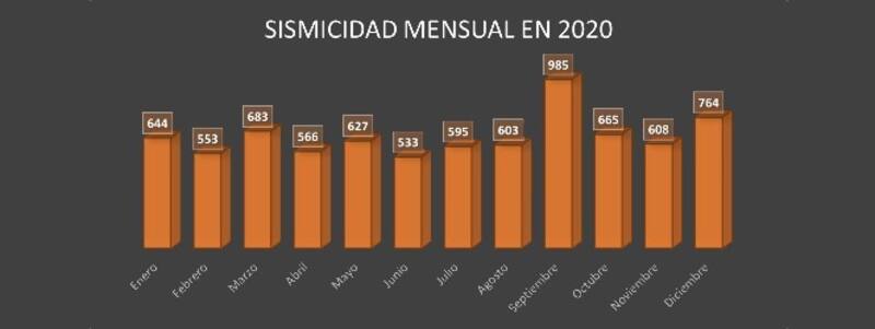 Al tomar la cifra total de los sismos localizados en 2020, es posible observar que ese año se procesaron en promedio 652 sismos mensuales o el equivalente a 21 sismos diarios.