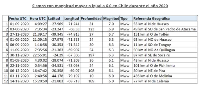 Según el organismo, el evento de mayor magnitud del año fue un 7.0 Mww ocurrido el 1 de septiembre de 2020, 55 km al norte de Huasco en la costa frente a la Región de Atacama, a 31 km de profundidad. El sismo, percibido entre las regiones de Antofagasta y Metropolitana, tuvo una intensidad máxima de VII en la escala de Mercalli en localidades cercanas al epicentro. Se trató de un evento interplaca, producto de la subducción de la placa de Nazca bajo la Sudamericana, al que le siguieron varias réplicas, entre ellas dos de 6.1 y 6.3 ocurridas el mismo 1 de septiembre.