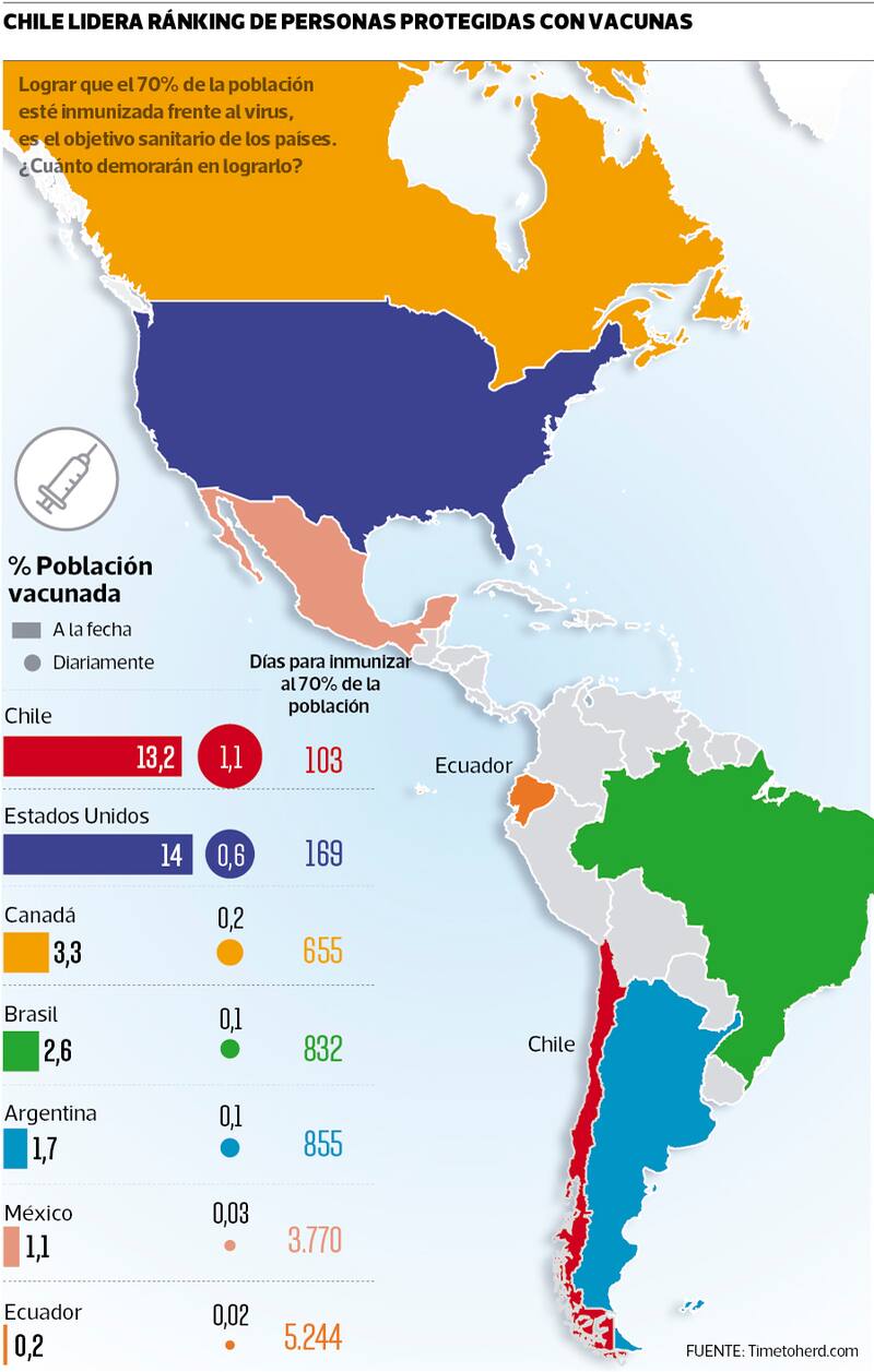 Para Chile los números son más que positivos. En solo 103 días, nuestro país logrará inocular al 70% de la población y se convertirá en el segundo país después de Israel (40 días) en conseguir esta meta. ¿Cómo se obtiene esa cantidad de días? En términos simples, al 70% de la población de cada país, le resta la cantidad de vacunas administradas y se divide por el promedio de dosis diarias de vacunas inoculadas.