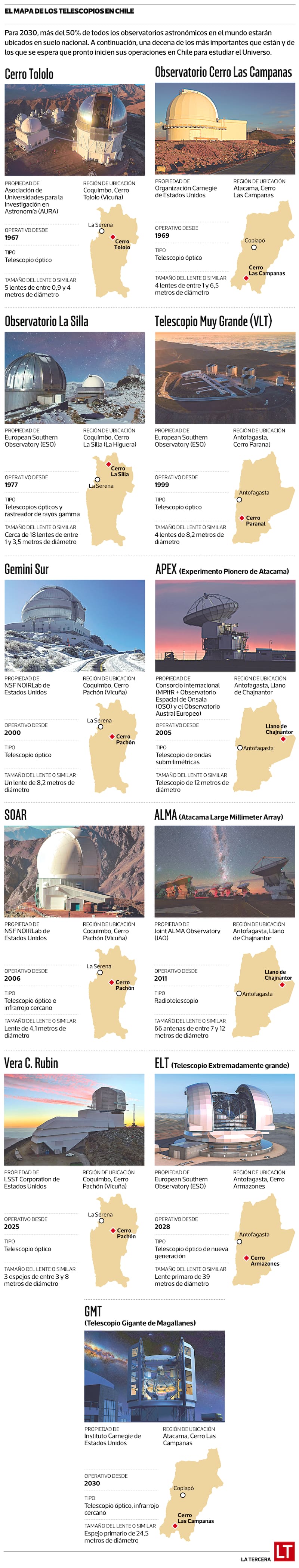 Estos telescopios están distribuidos entre las regiones de Antofagasta y Coquimbo para captar todas las noches la mayor cantidad de información sobre los fenómenos astronómicos que ocurren sobre nuestras cabezas. Sus tamaños varían, tanto en la altura de sus complejos como en la envergadura de su cúpula. Pero lo más importante, y lo que se considera para clasificar un observatorio de otro, principalmente es el tamaño y poder de su lente.