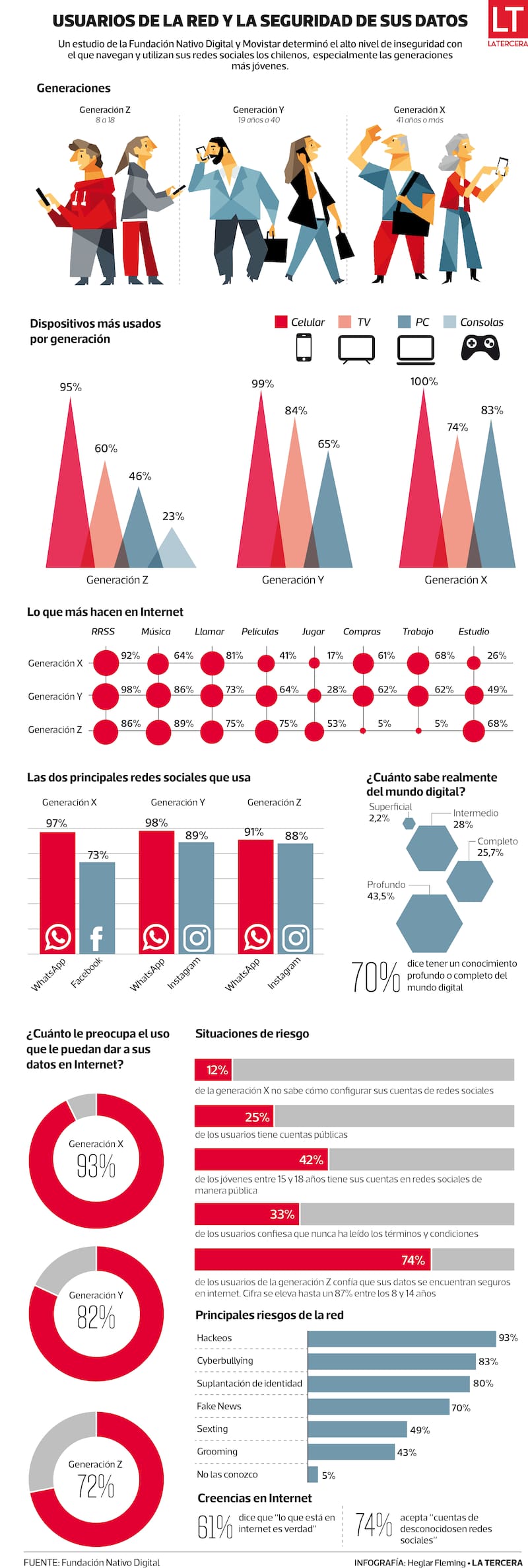 Entre el total de chilenos que declaran tener un conocimiento profundo de internet, un 76% cree que sus datos personales se encuentran seguros en la red. Mientras, un 74% de los encuestados que pertenecen a la generación Z confía que sus datos se encuentran seguros en la red, la cifra se eleva hasta un 87% entre los entrevistados de 8 y 14 años.