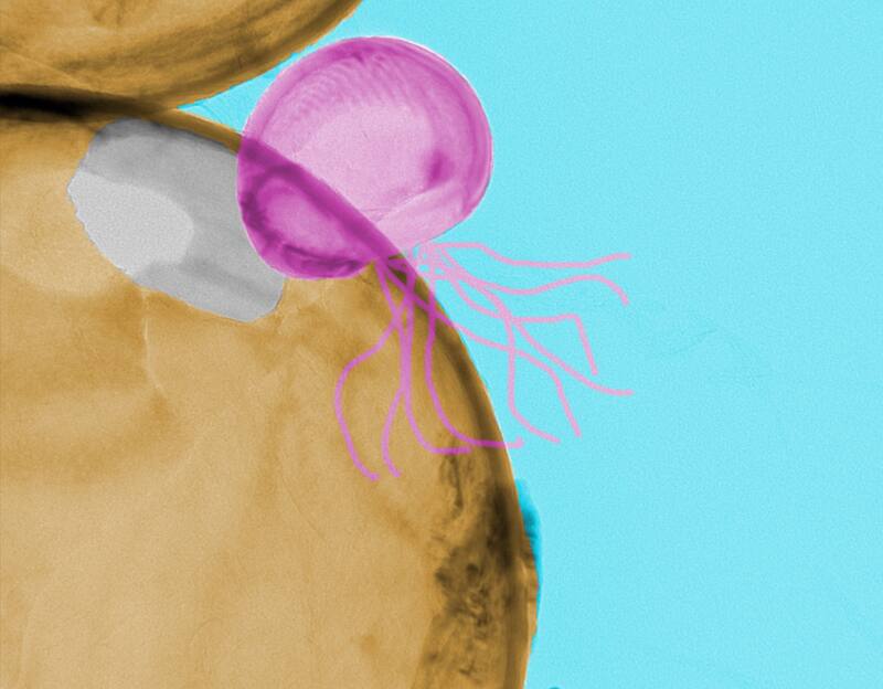 Una hermosa medusa rosa no es tal. Se trata de dióxido de titanio (TiO2) que en su fase más común es conocido como rutilo, con interesantes propiedades ópticas descritas desde hace siglos. Las diferencias de tamaño y formas que se logran, coloreadas sutilmente, permiten imaginar una medusa surrealista entre formaciones de rocas submarinas.