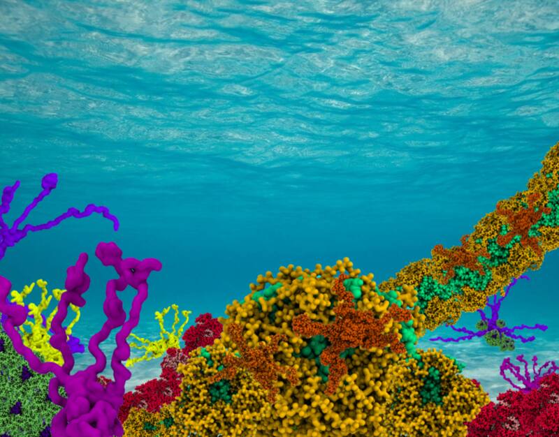 Lo que parece ser un arrecife de corales, es en verdad la composición de distintas imágenes de nanopartículas de forma y tamaño variables. Las coloraciones apropiadas de formas diversas sobre un fondo de color acuoso permiten imaginarse un arrecife de corales.