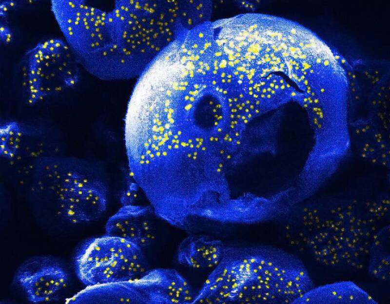 Las partículas de polietileno han sido coloreadas de azul y logran la apariencia de un arándano. Sobre este polietileno se han depositado nanopartículas de cobalto, un metal magnético, que aparece como polvo dorado contribuyendo a disfrazar los arándanos cuya forma irregular les hace aparecer de forma fantasmal en esta imagen de microscopía electrónica (SEM).