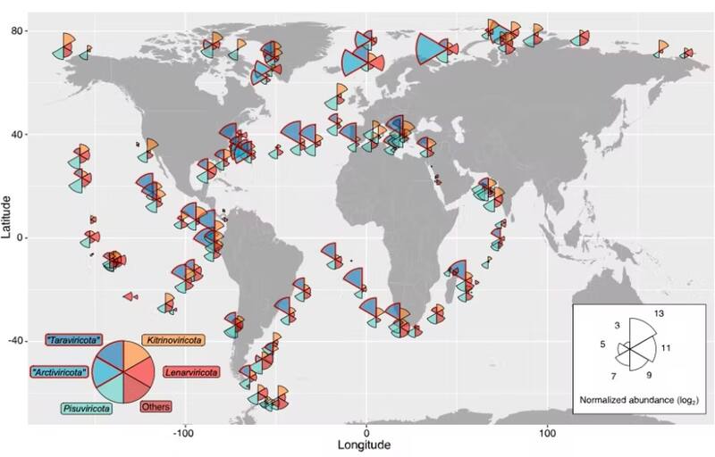 Identificamos un total de 5.504 nuevos virus de ARN marinos y duplicamos el número de filos de virus de ARN conocidos de cinco a 10. El mapeo geográfico de estas nuevas secuencias reveló que dos de los nuevos filos eran particularmente abundantes en vastas regiones oceánicas, con preferencias regionales en zonas templadas y aguas tropicales (la Taraviricota, llamada así por las expediciones de Tara Oceans) o el Océano Ártico (la Arctiviricota).