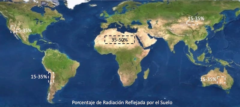 El porcentaje de diferencia entre un lugar y otro, como África con América o Europa, ”es el porcentaje de la radiación solar que el suelo refleja. Fuera de los polos, los desiertos, incluido el Desierto de Atacama, son las regiones más brillantes de la Tierra, reflejando entre el 15% y el 35% de la radiación solar incidente. Una excepción es el desierto del Sahara que refleja en algunos puntos casi el 50% de la radiación solar incidente”, señala el académico de la Usach.